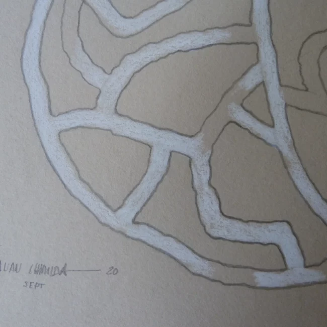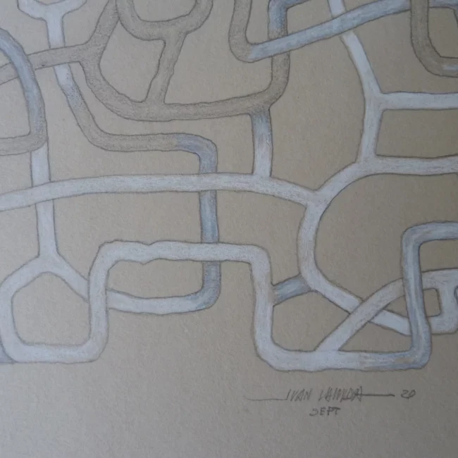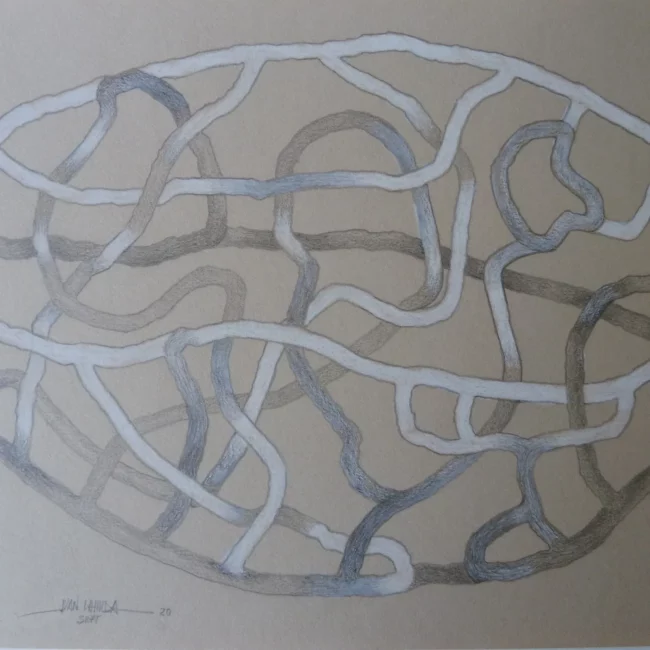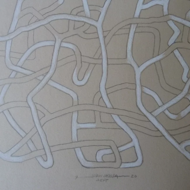 Juan continua jugando y experimentando en la búsqueda de nuevas dimensiones. Esta serie de obras trabajadas con lápiz sobre papel muestran planos entremezclados, creando una obra muy orgánica y muy corporal. Como si se tratasen de venas o articulaciones…